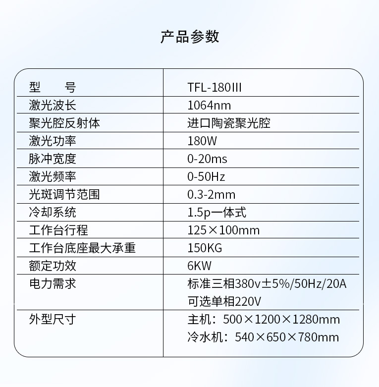 普通型模具激光焊機TFL-180Ⅲ是通發激光公司的模具激光焊機中銷量較大的傳統型,配置激光頭手搖升降與工作臺按鈕電動升降實現焊接不同厚度模具的激光焊加工。本系列機型適用于各類精密注塑模具激光補焊、壓鑄模具激光修補焊接;同時也適合鑄件沙孔激光修補、模具磨損激光修復、過切加工等的激光修補;各類金屬結構件激光焊接加工、不銹鋼首飾激光焊接加工。